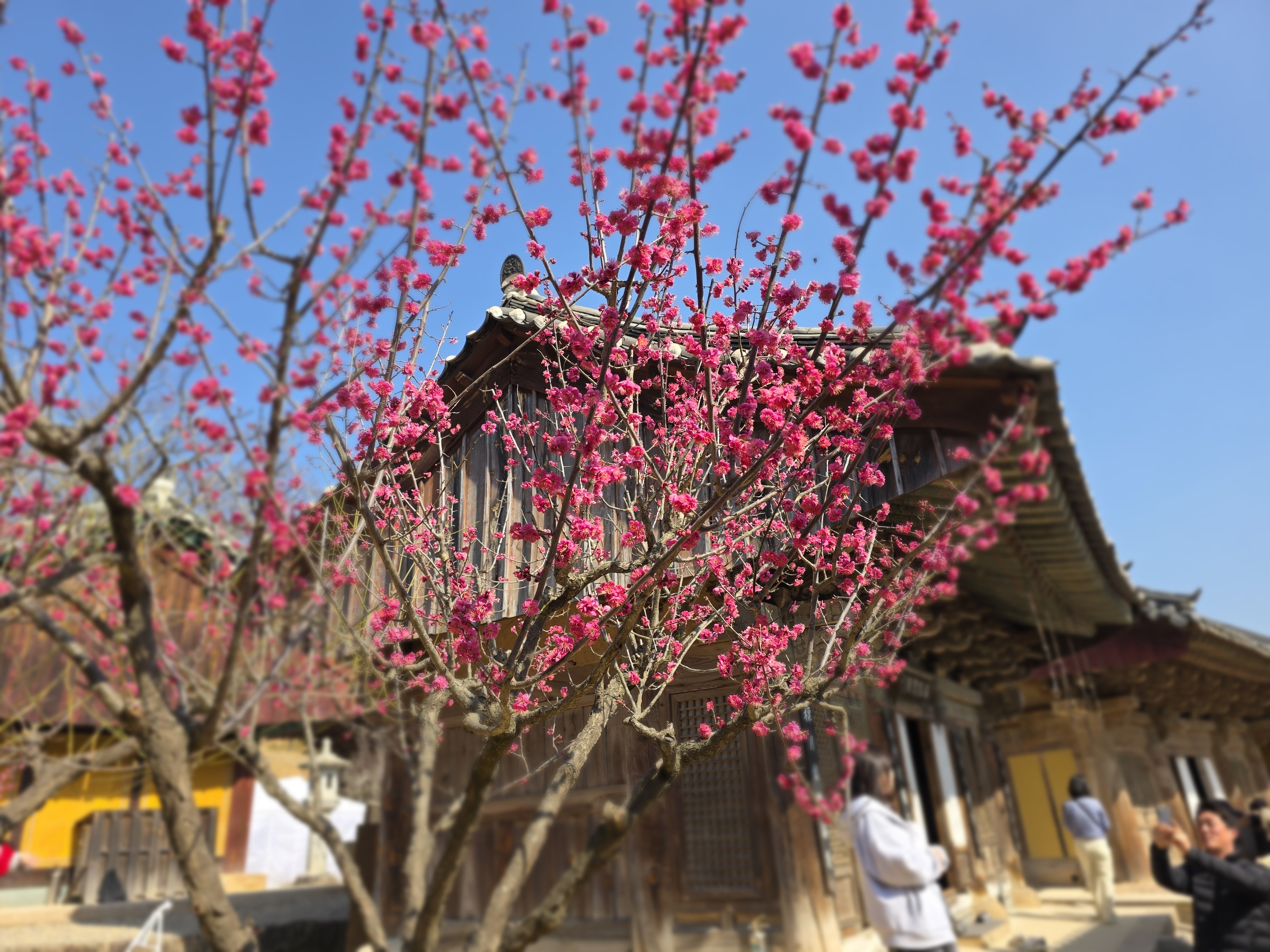 올해 처음보는 꽃구경에 마음까지 화사해지는 느낌! 붉은 빛깔이 은은하게 번지며 사찰의 고즈넉한 분위기와 어우러져 정말 아름다웠어요. 바람에 살짝 흔들릴 때마다 향기가 퍼져서 방문객들의 발걸음을 멈추게 했고, 사진을 찍는 사람들로 가득했어요. 겨울 끝자락에 만난 홍매화의 화사함은 봄을 앞두고 마음을 설레게 했어요.