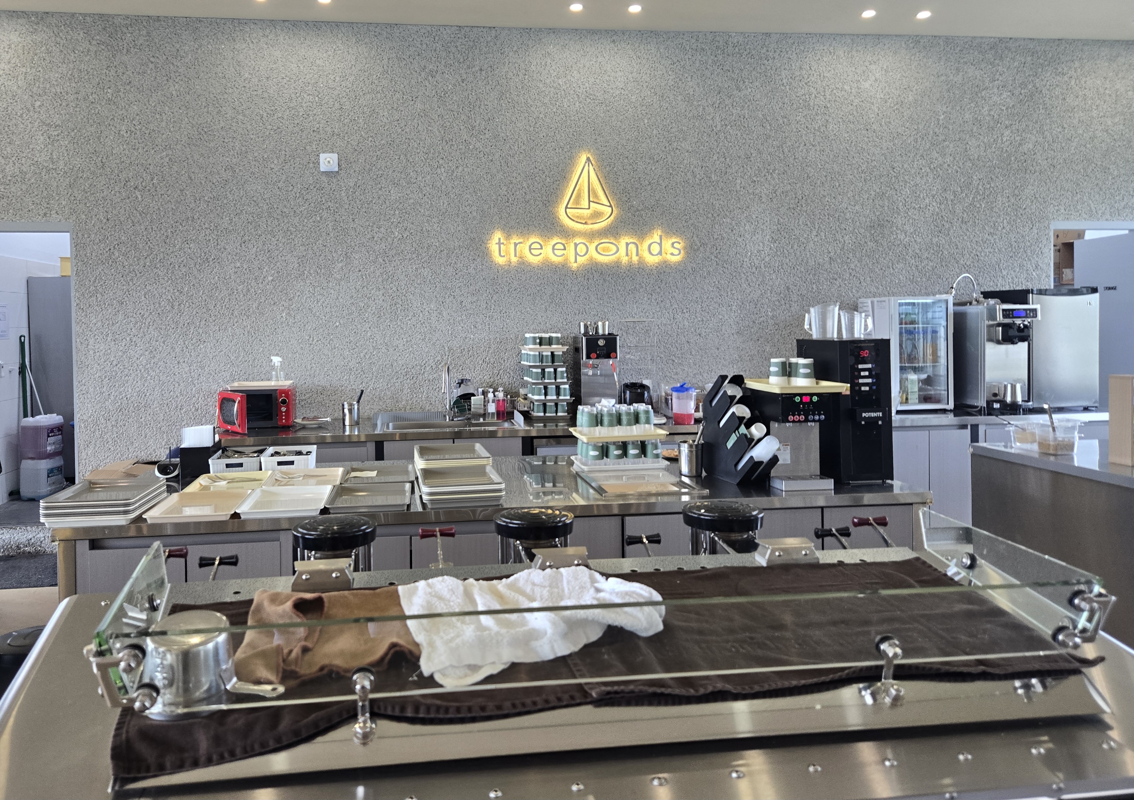 실내에서 연못을 바라보며 즐긴 커피 타임