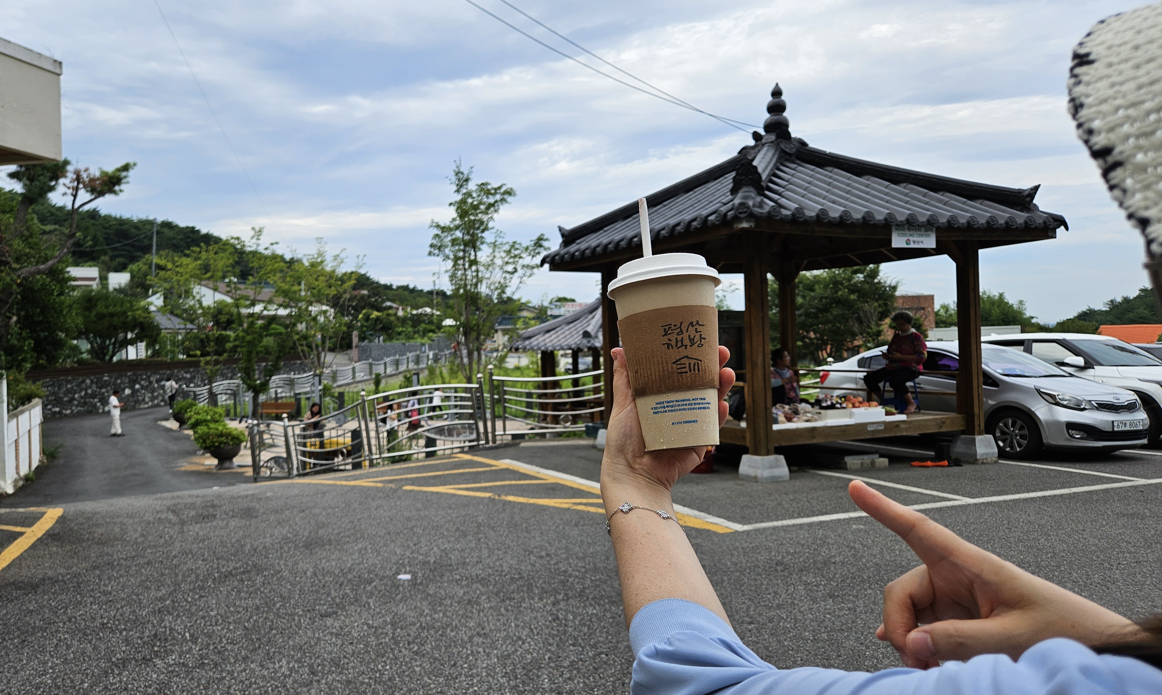 동생네와 양산 여행 첫째날 중 가장 기억에 남는 순간을 꼽으라면, 단연코 스타벅스 통도사점에서의 커피 타임이에요.연꽃이 만개한 정원 뷰, 그리고 갑작스레 내린 소나기 속에서 마신 따뜻한