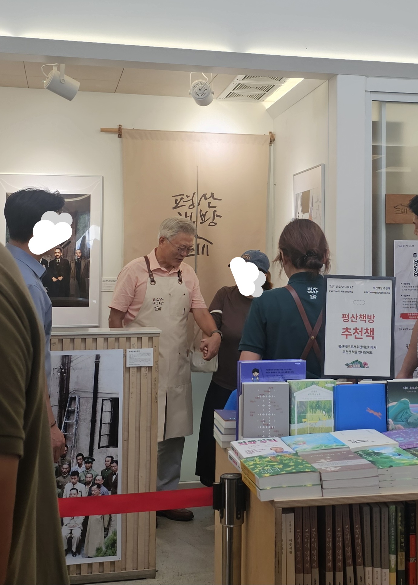 요일은 정해져 있지 않고, 오전에는 11시, 오후에는 네 시에 나오신다고 해요.  제가 갔던 날은 정말 운이 좋았어요. 땡볕 아래 줄을 서서 기다렸는데, 드디어 책방 안에서 문 대통령을 마주했어요. 따뜻한 미소로 손도 잡아주시고, 사진도 함께 찍어주셨어요. 그 순간의 온기와 배려는 오래도록 기억에 남았어요.
