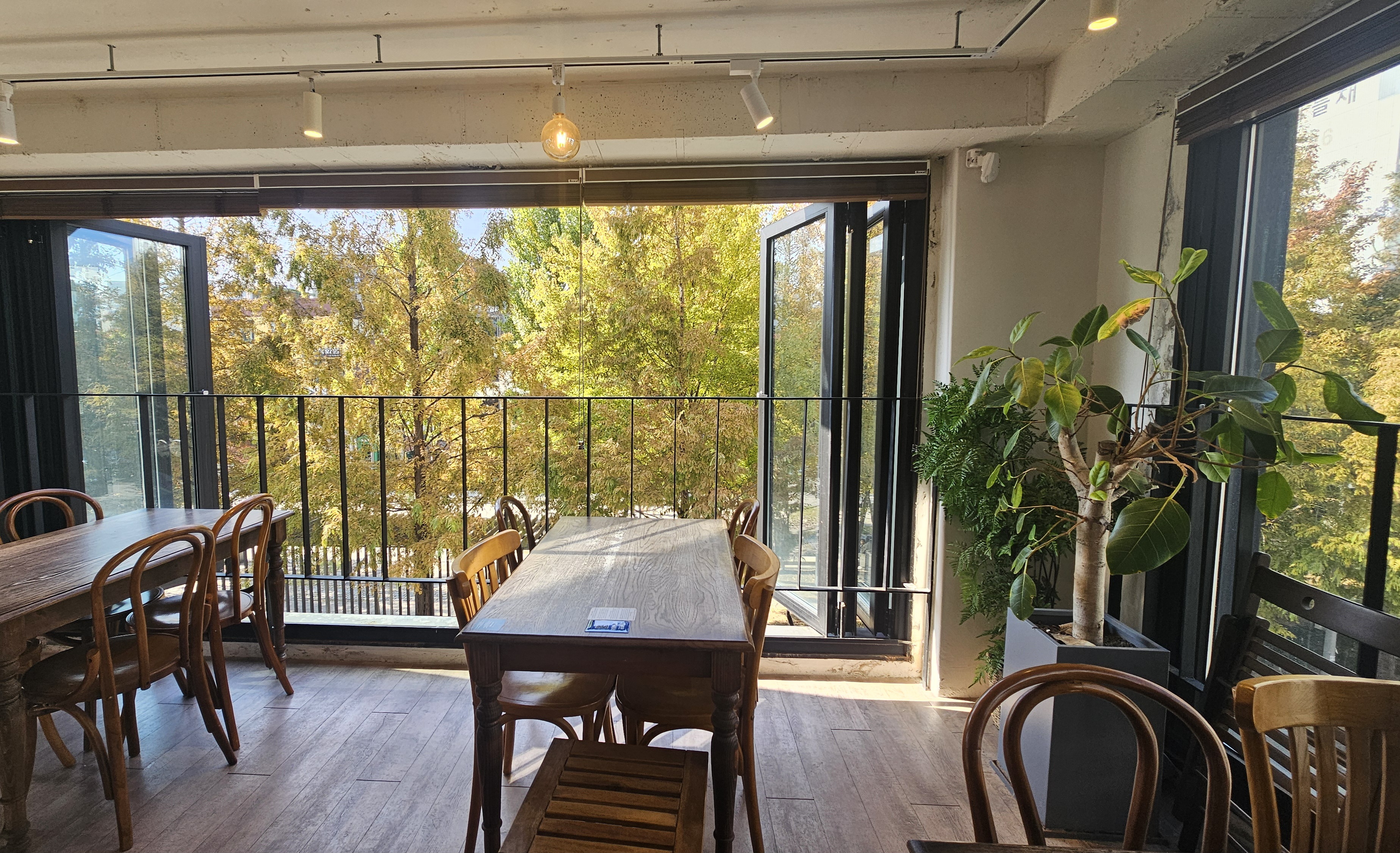 각 층마다 다른 분위기를 느낄 수 있어요. 화이트톤과 우드톤이 어우러진 깔끔한 인테리어에, 4층 루프탑에서는 경의선 숲길의 단풍을 한눈에 내려다볼 수 있어요. 특히 가을엔 폴딩도어를 열어 숲속 같은 분위기를 연출해줘서, 창밖 뷰만으로도 힐링이 돼요. 우리는 폴링도어 앞에서 단풍도 맘껏 즐길 수 있는 2층에 자리 잡았어요.