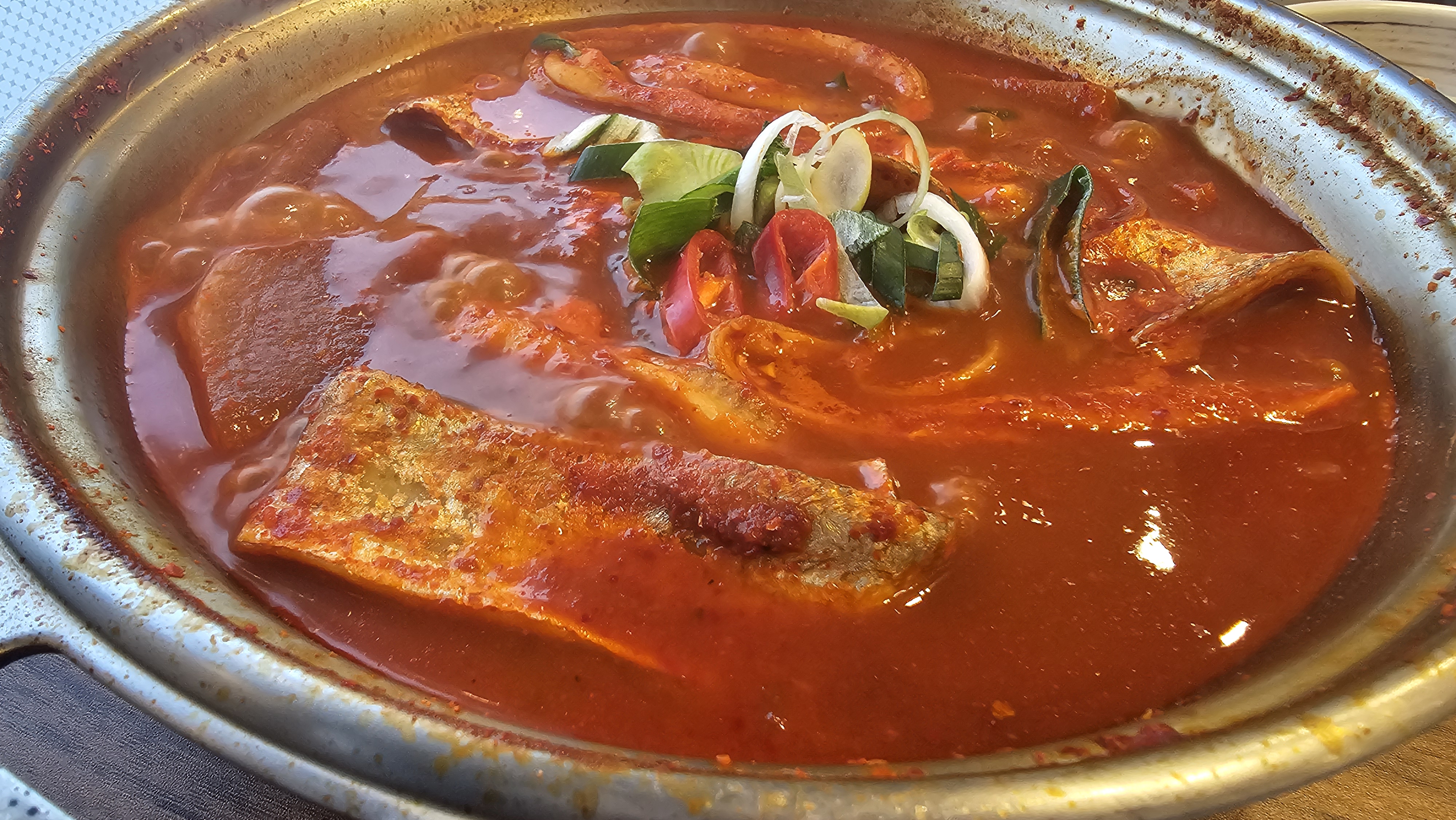 잠시 후 메인인 갈치조림이 커다란 냄비에 보글보글 끓으며 등장했어요. 빨갛게 끓어오르는 비주얼이 정말 군침 돌았어요. 갈치가 큼직하게 썰려서 양념에 푹 잠겨 있었는데, 살이 부드럽고 촉촉해서 젓가락으로 살짝만 건드려도 결이 고스란히 떨어졌어요. 매콤하면서도 달큰한 양념이 밥이랑 너무 잘 어울려서 밥도둑이라는 말이 딱 맞았어요.