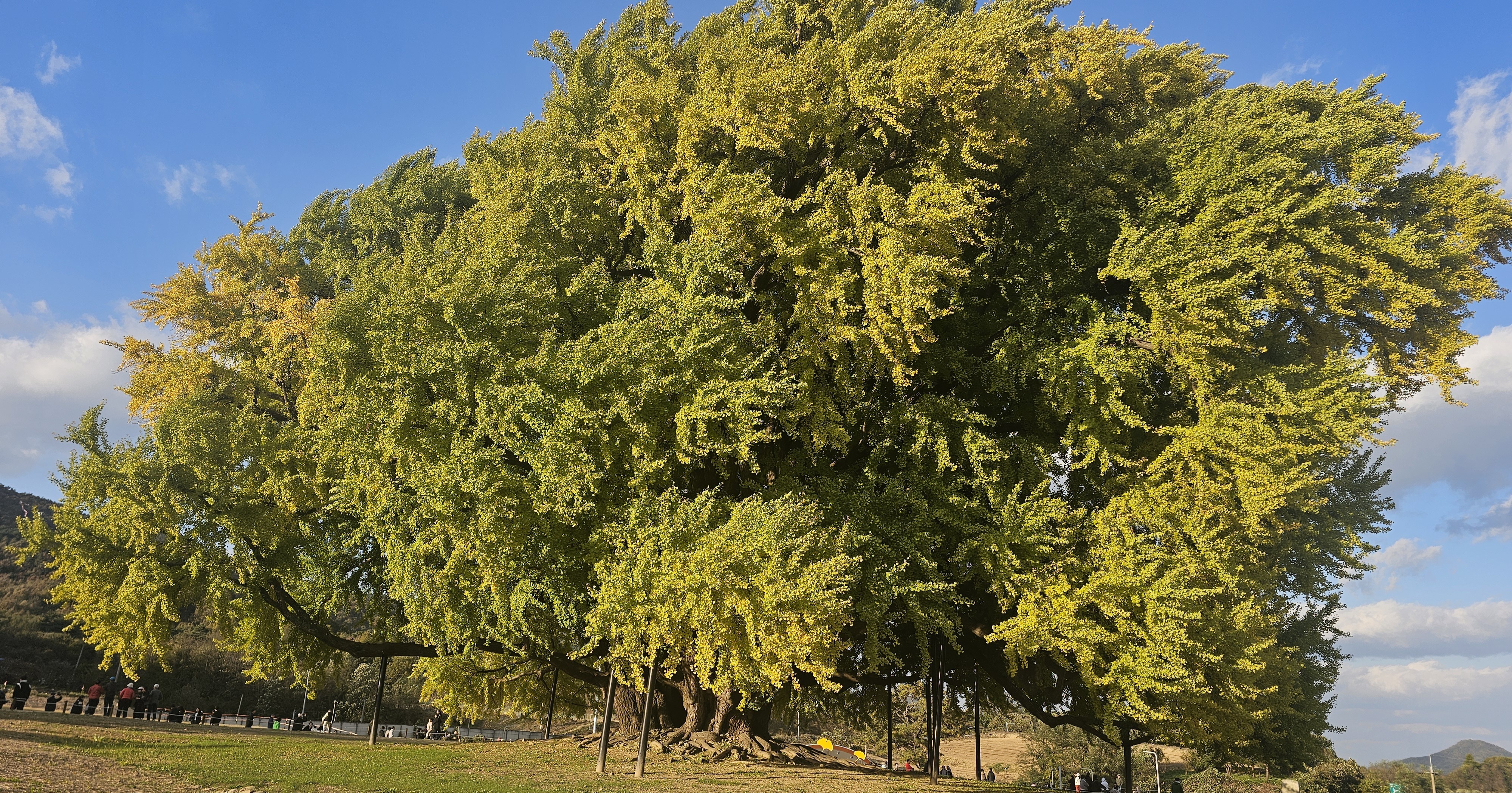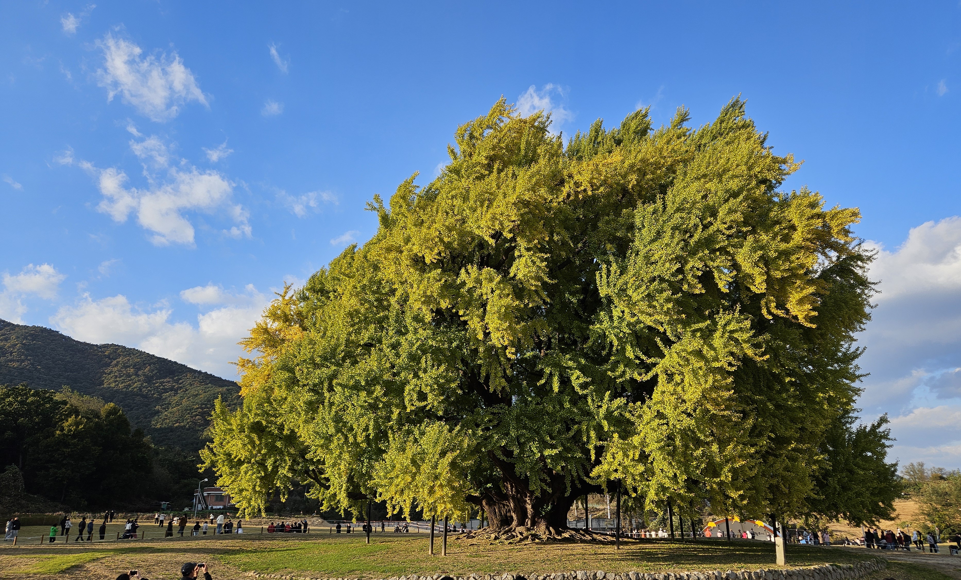 높이 32m, 둘레 16m가 넘는 이 나무는 그 자체로 하나의 역사이자 자연유산이에요. 매년 가을이면 황금빛으로 물들어 장관을 이루는데, 이날은 아직 단풍이 50% 정도만 물든 상태였어요. 기대했던 절정의 노란 은행잎은 조금 아쉬웠지만, 그만큼 다음 주가 더 기대되는 풍경이었어요.