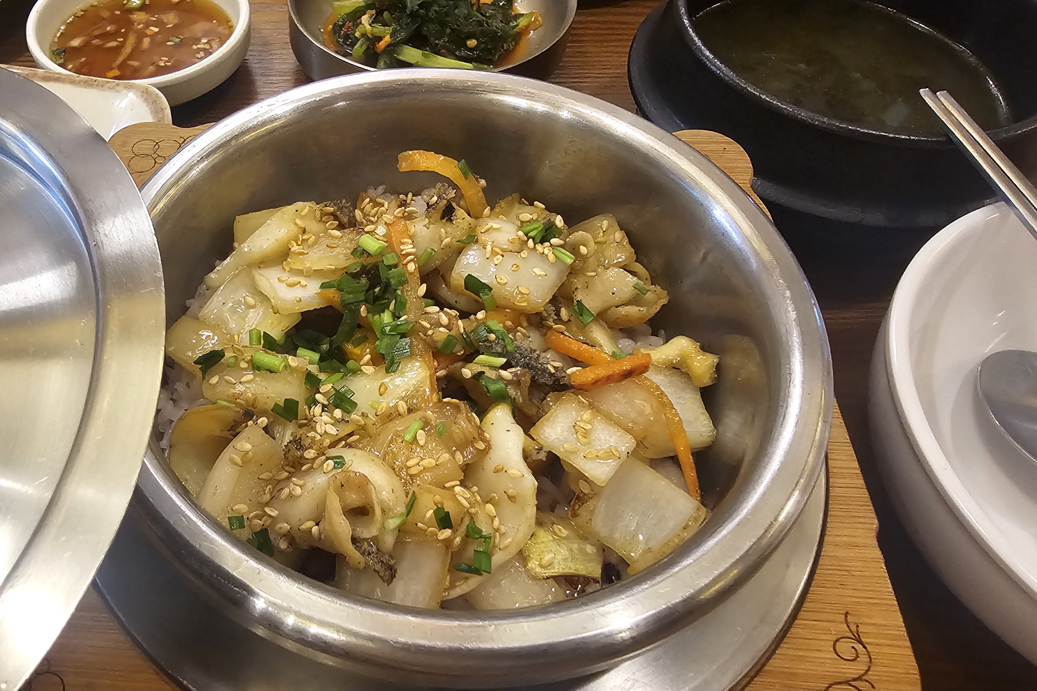 전복솥밥은 갓 지은 솥밥 위에 통통한 전복이 올라가 있어 비주얼부터 만족스러웠고, 함께 나온 반찬들도 하나하나 정갈했어요.