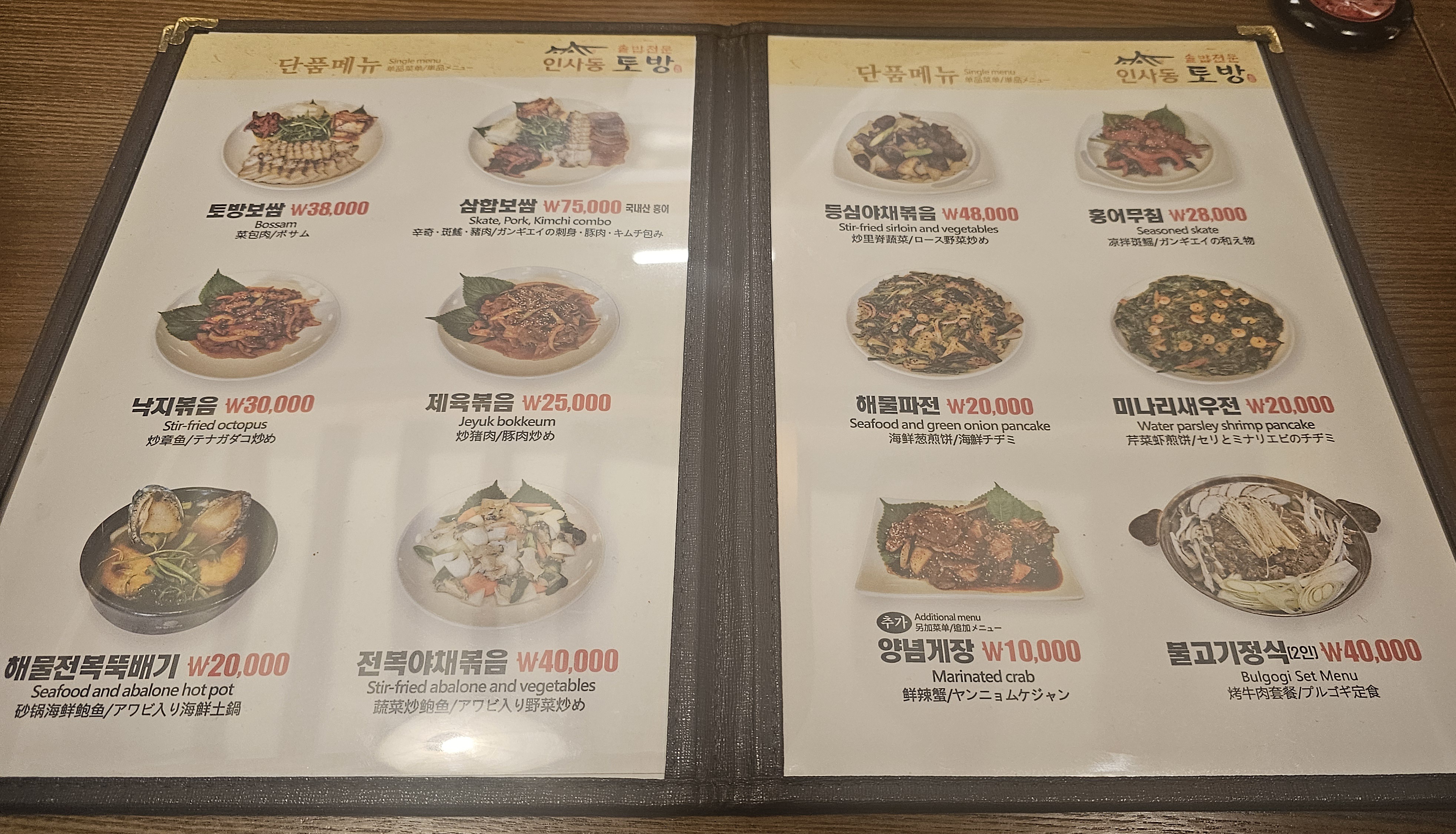 메뉴판에는 다양한 한식이 있었지만, 우리는 전복이 들어간 메뉴로 통일했답니다.