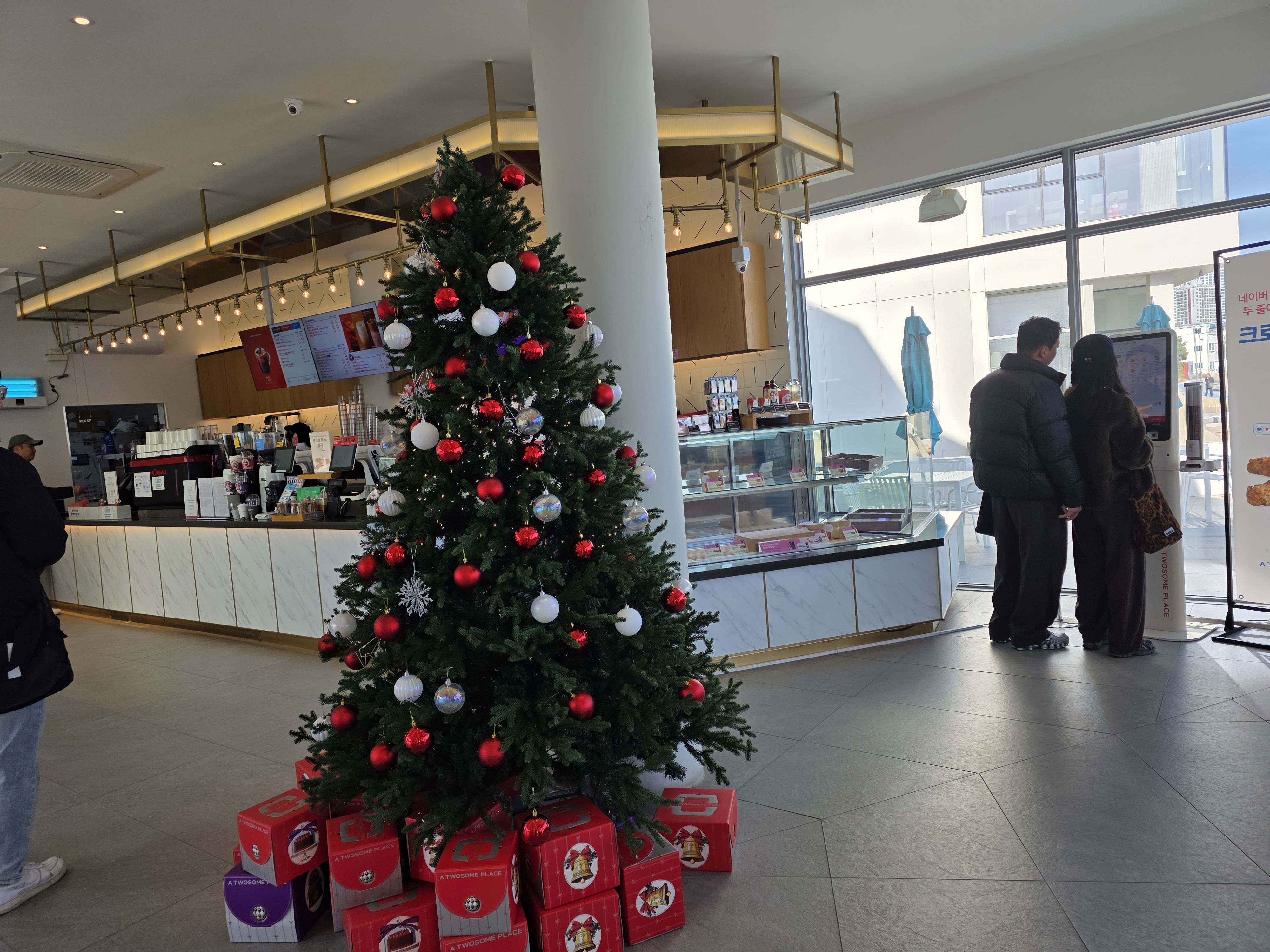 카페 안은 벌써 크리스마스 분위기로 가득했어요. 입구에는 반짝이는 트리와 귀여운 오너먼트가 반겨주고, 곳곳에 놓인 리스와 전구 장식이 연말의 설렘을 더해줬어요. 따뜻한 조명과 어우러진 인테리어 덕분에, 커피 한 잔의 여유가 더욱 포근하게 느껴졌답니다. 연말 감성을 느끼고 싶은 분들께 강력 추천하고 싶은 공간이에요.