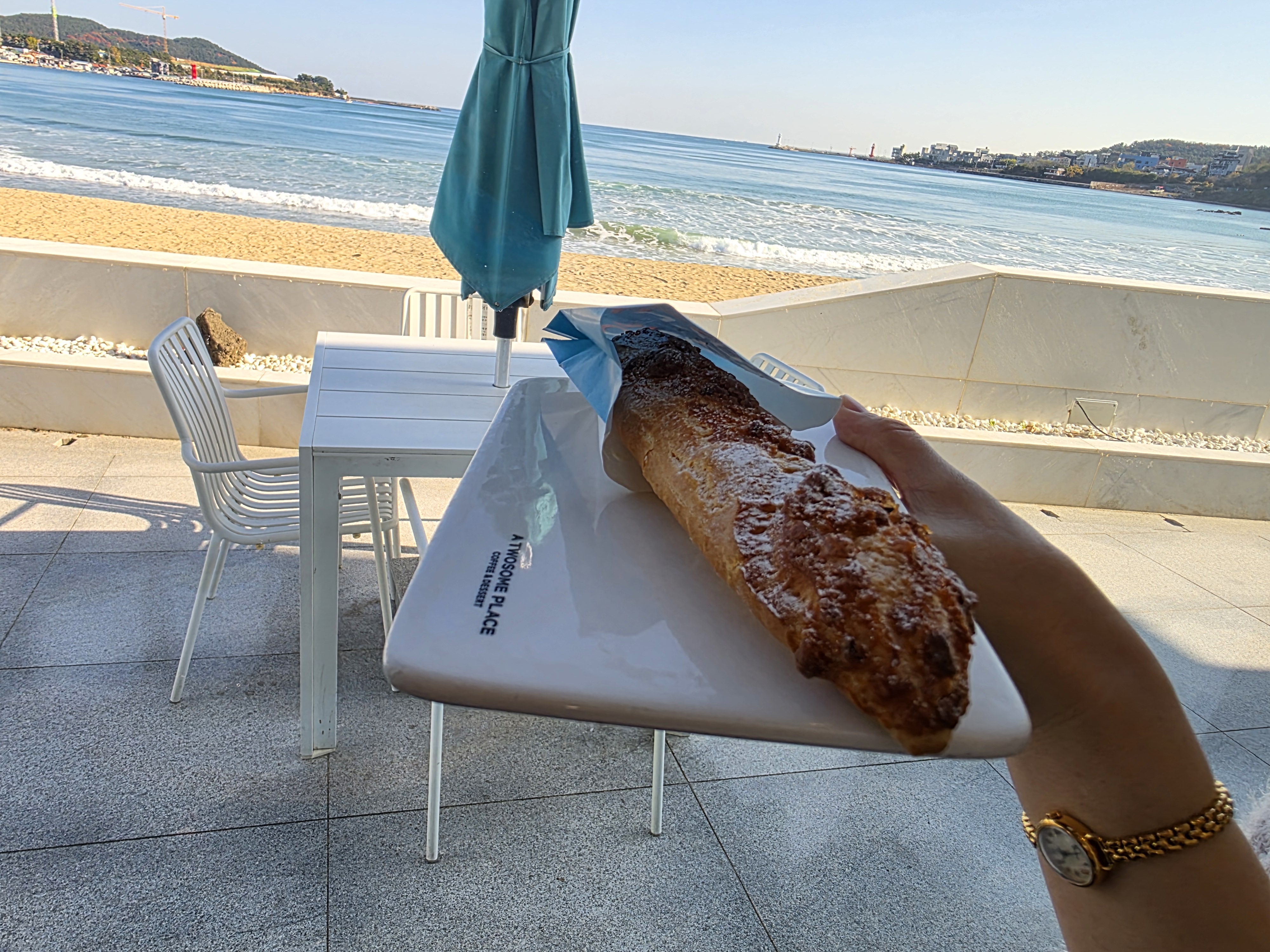 바다를 바라보며 앉아 있자니, 바람 소리와 잔잔한 음악이 어우러져 마음까지 편안해졌어요. 사람들로 북적이기 전의 이른 시간대에만 느낄 수 있는 고요함이 참 좋았어요.