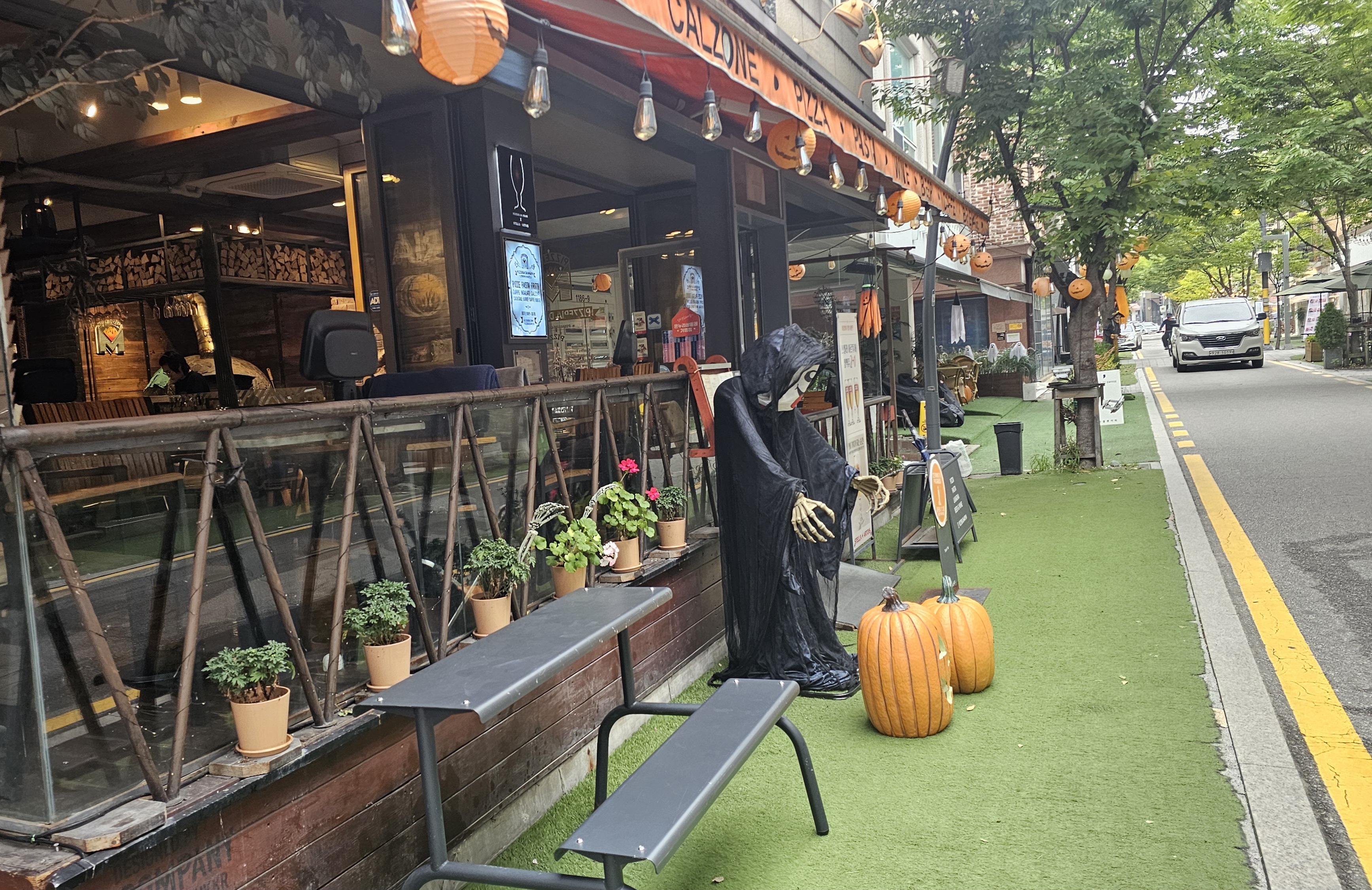 카페 앞 유령 인형과 코믹한 해골 포토존