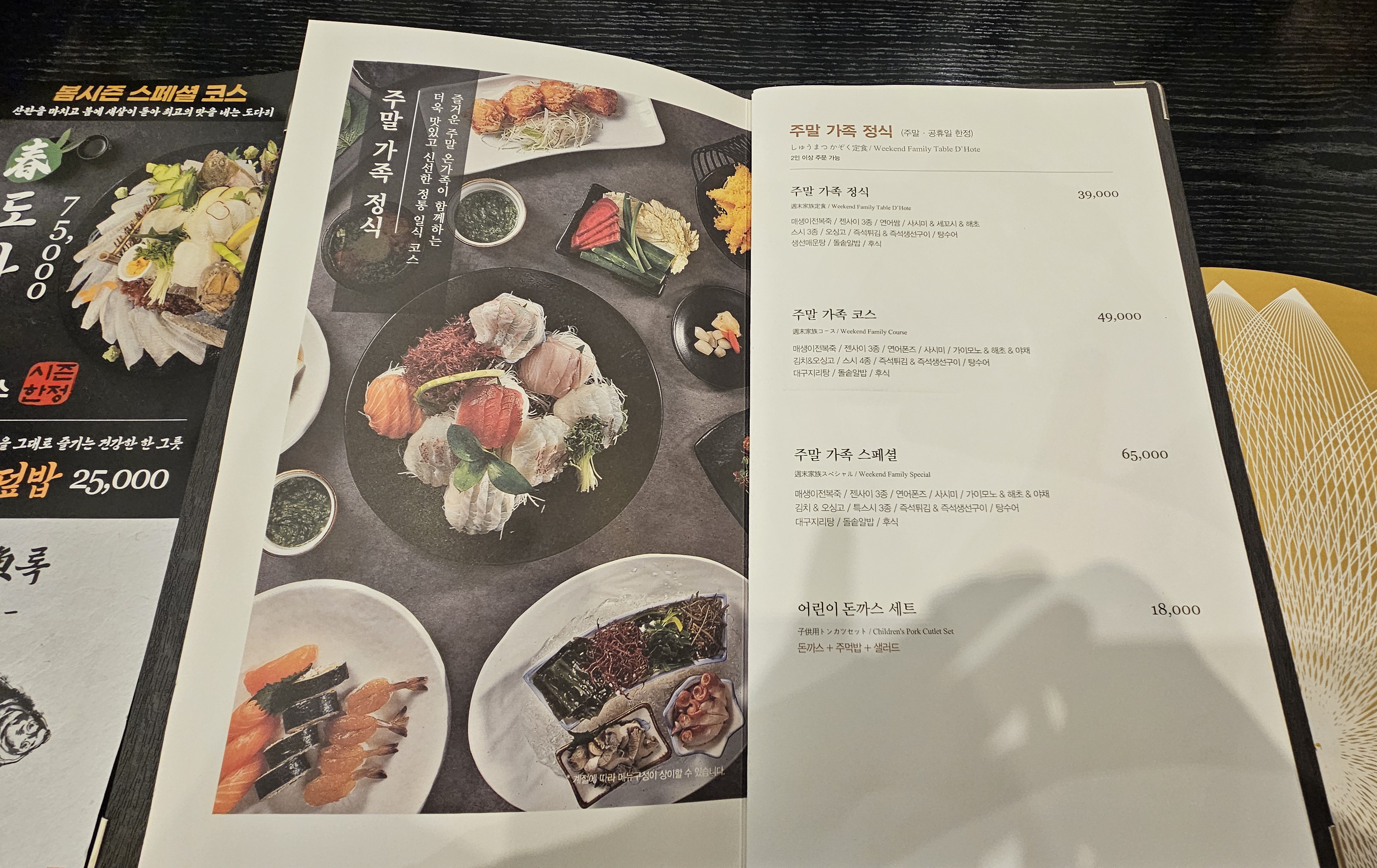 긴자는 다양한 코스 요리가 있는데요, 저희는 주말에만 주문 가능한 가성비 갑 메뉴! '주말 가족정식'으로 주문했습니다. 1인당 가격 대비 구성이 정말 알차서 가족 외식 메뉴로 인기가 많아요.
