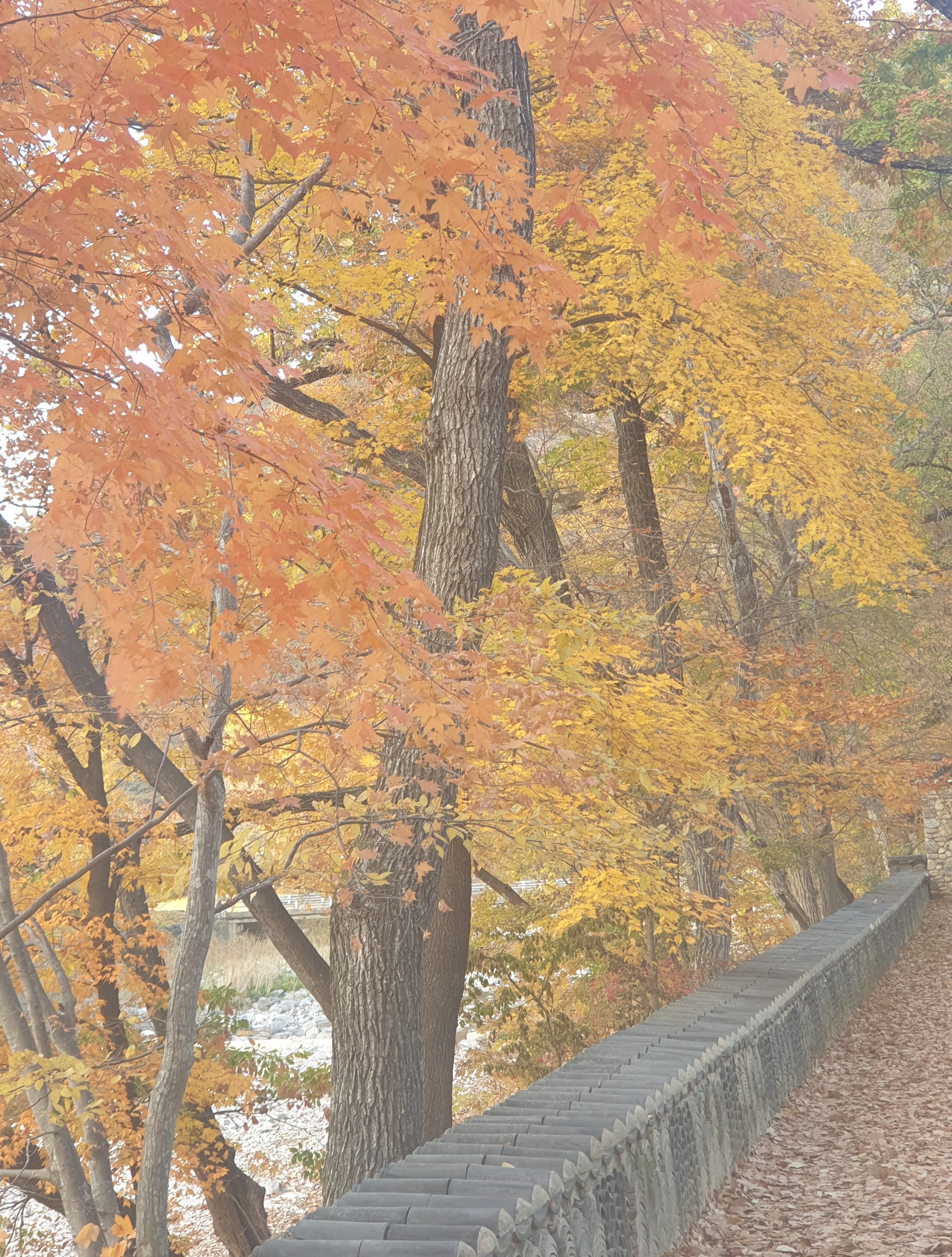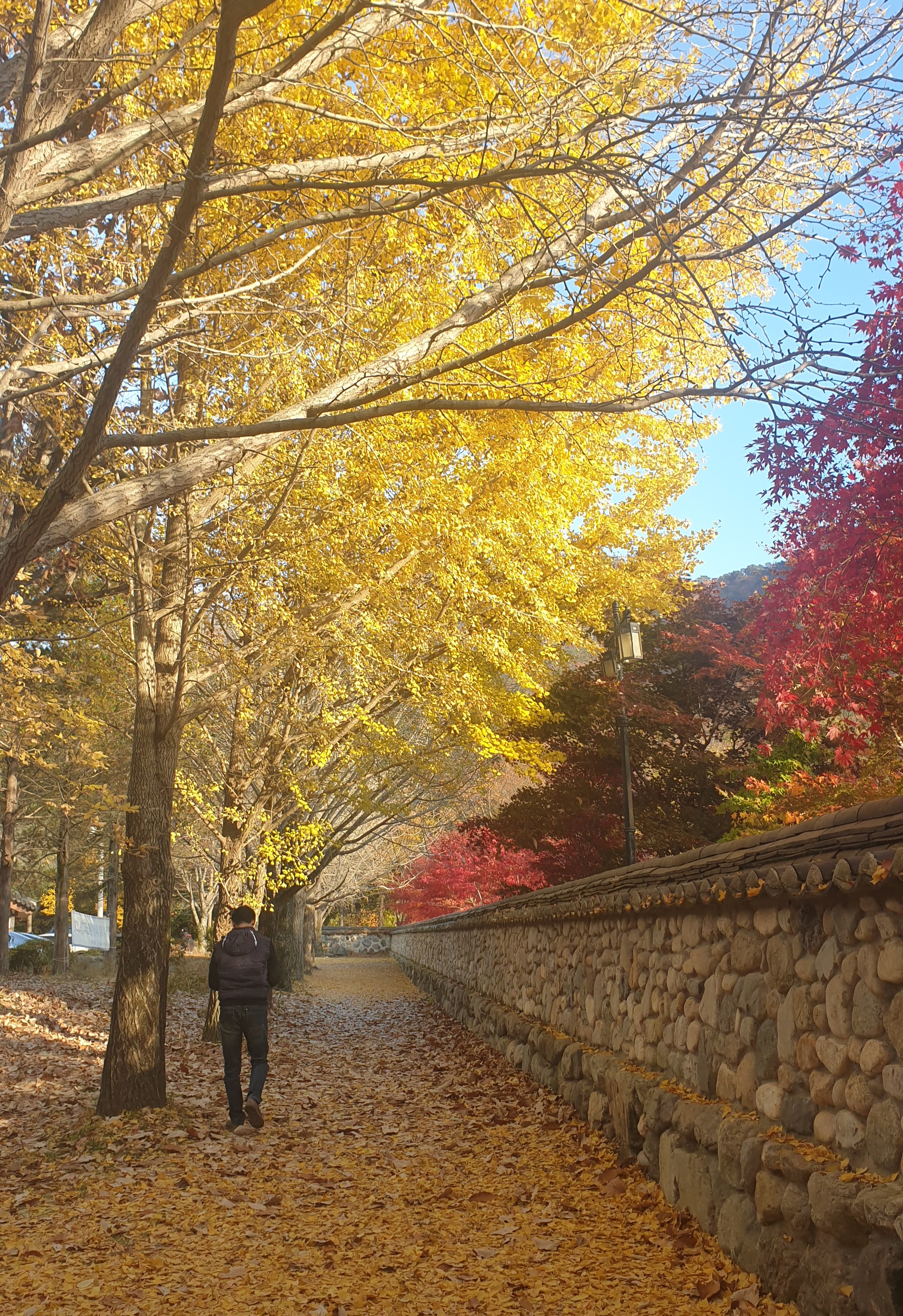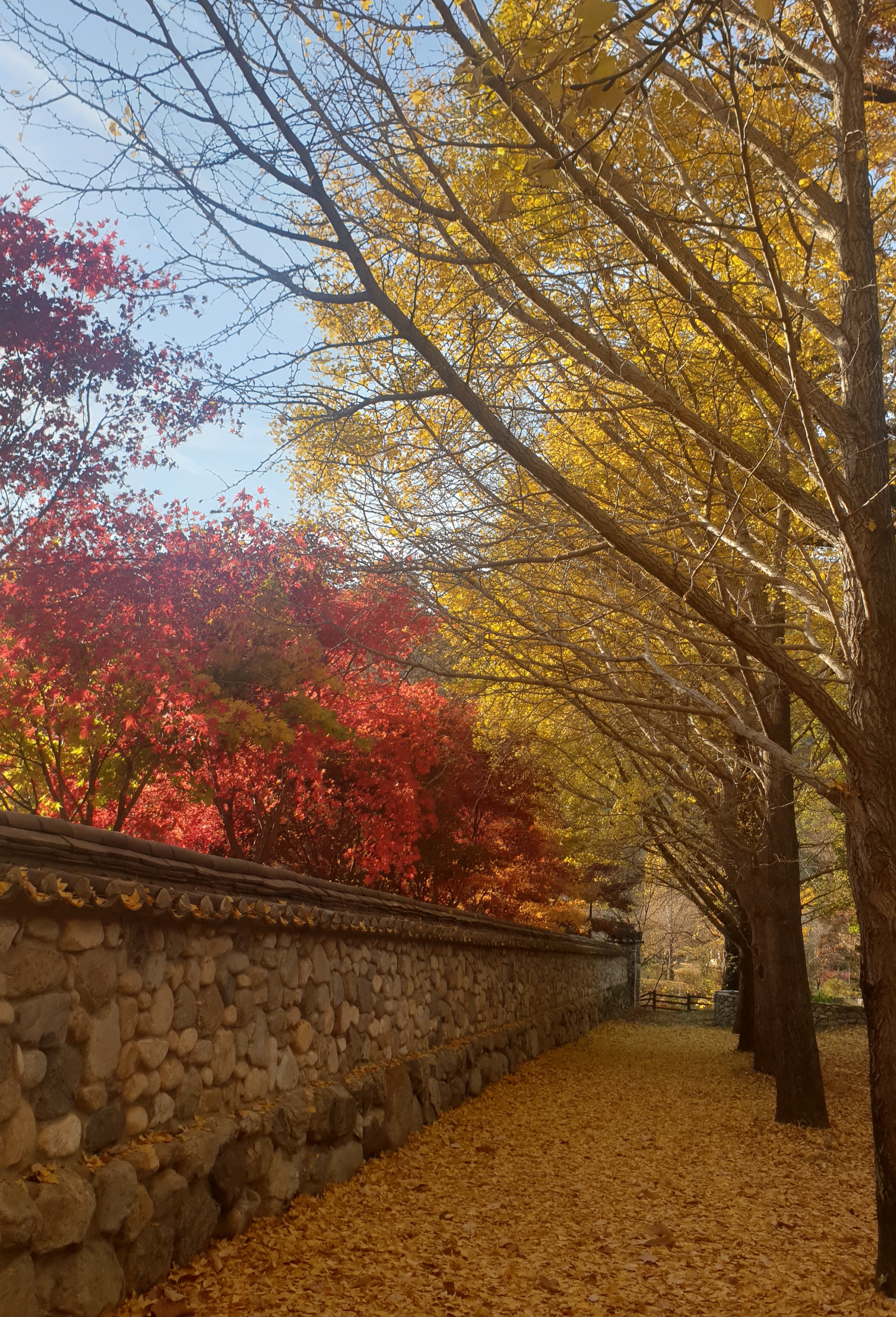 - 돌담길 위로 물든 단풍, 사찰과 어우러진 풍경