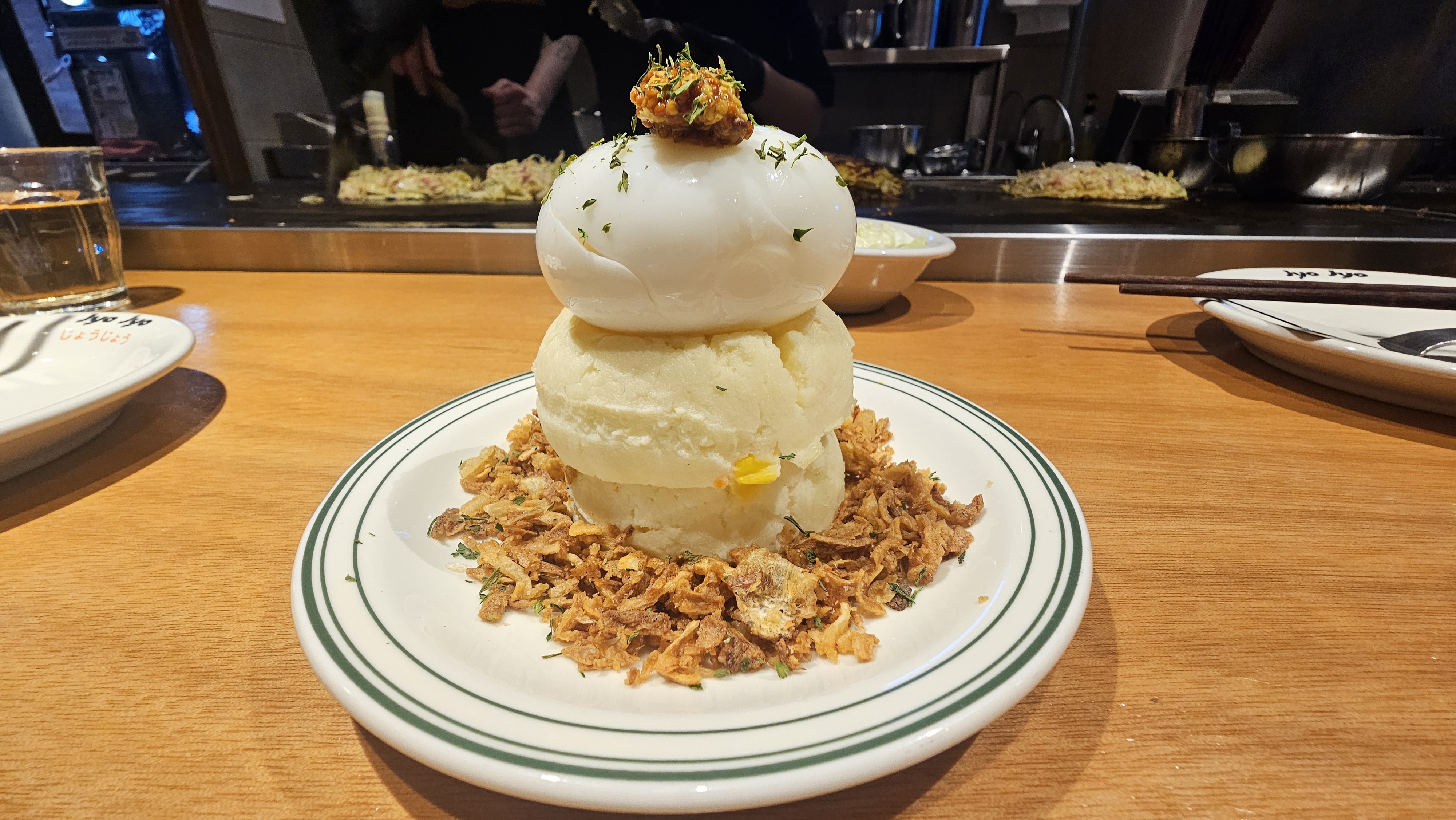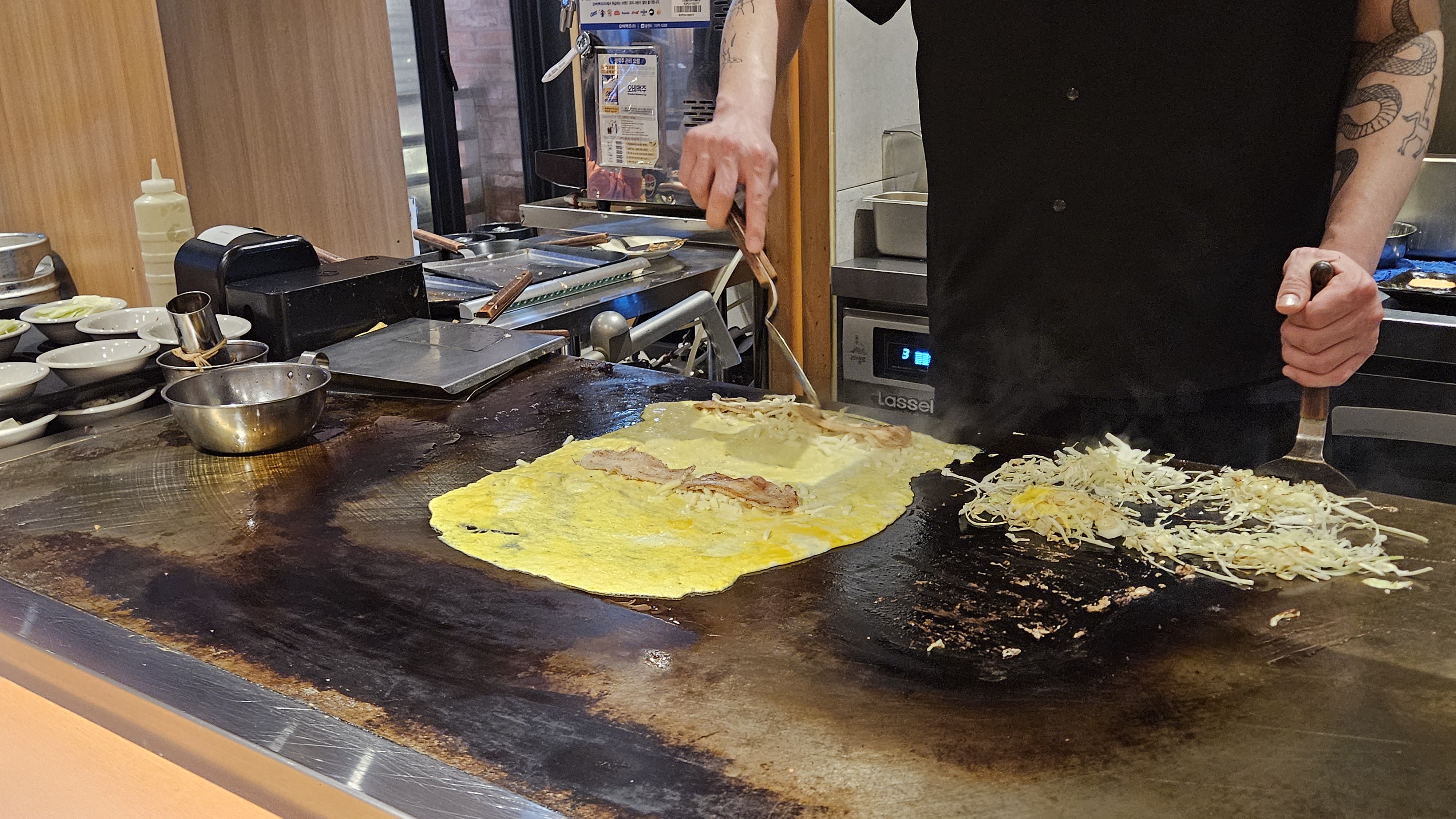 돼지고기와 치즈가 듬뿍 들어간 오코노미야끼는 겉은 바삭하고 속은 촉촉해서 식감이 정말 좋았어요. 철판에서 바로 구워내 따뜻한 상태로 제공되니 풍미가 배가되더라고요.