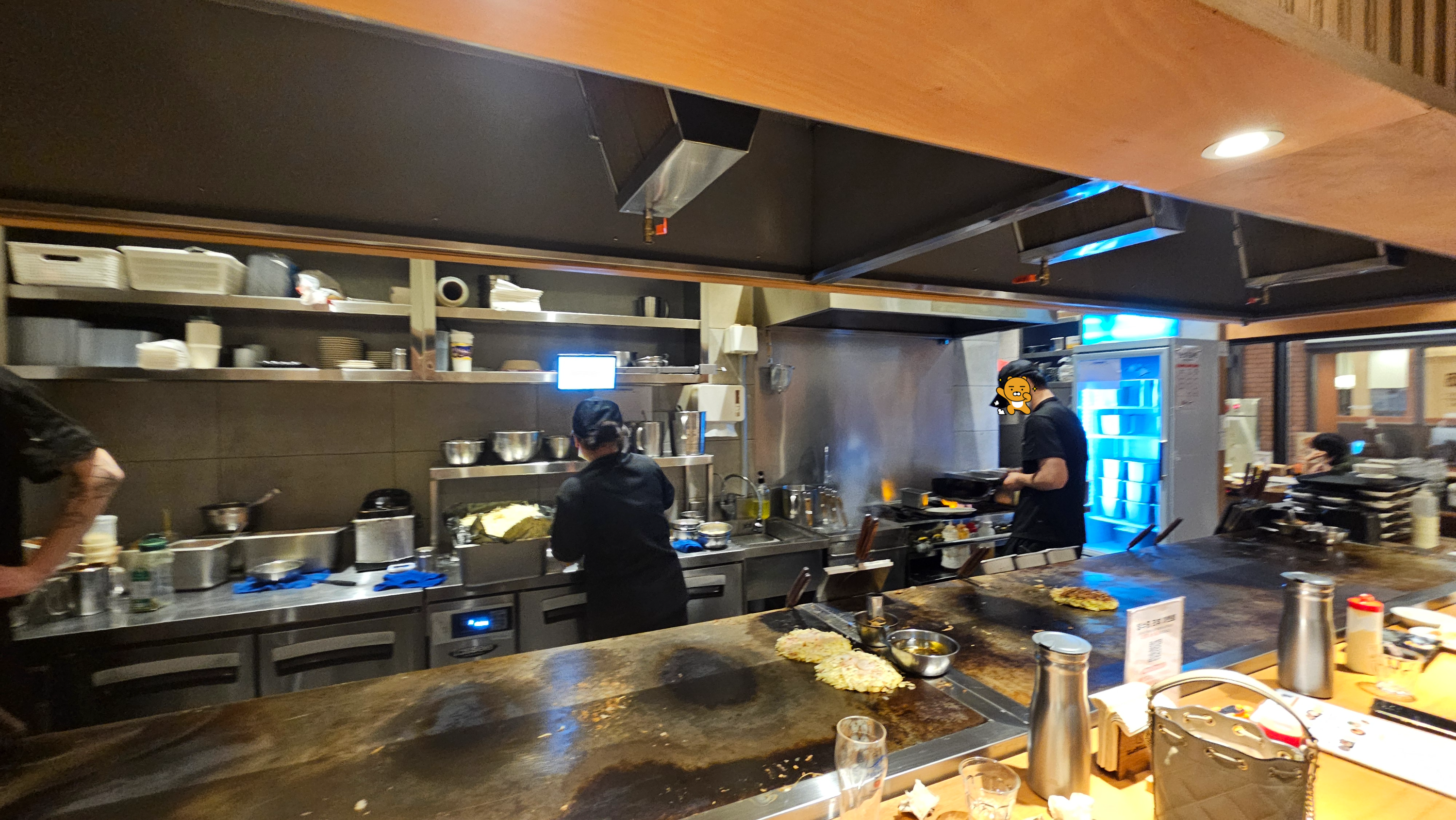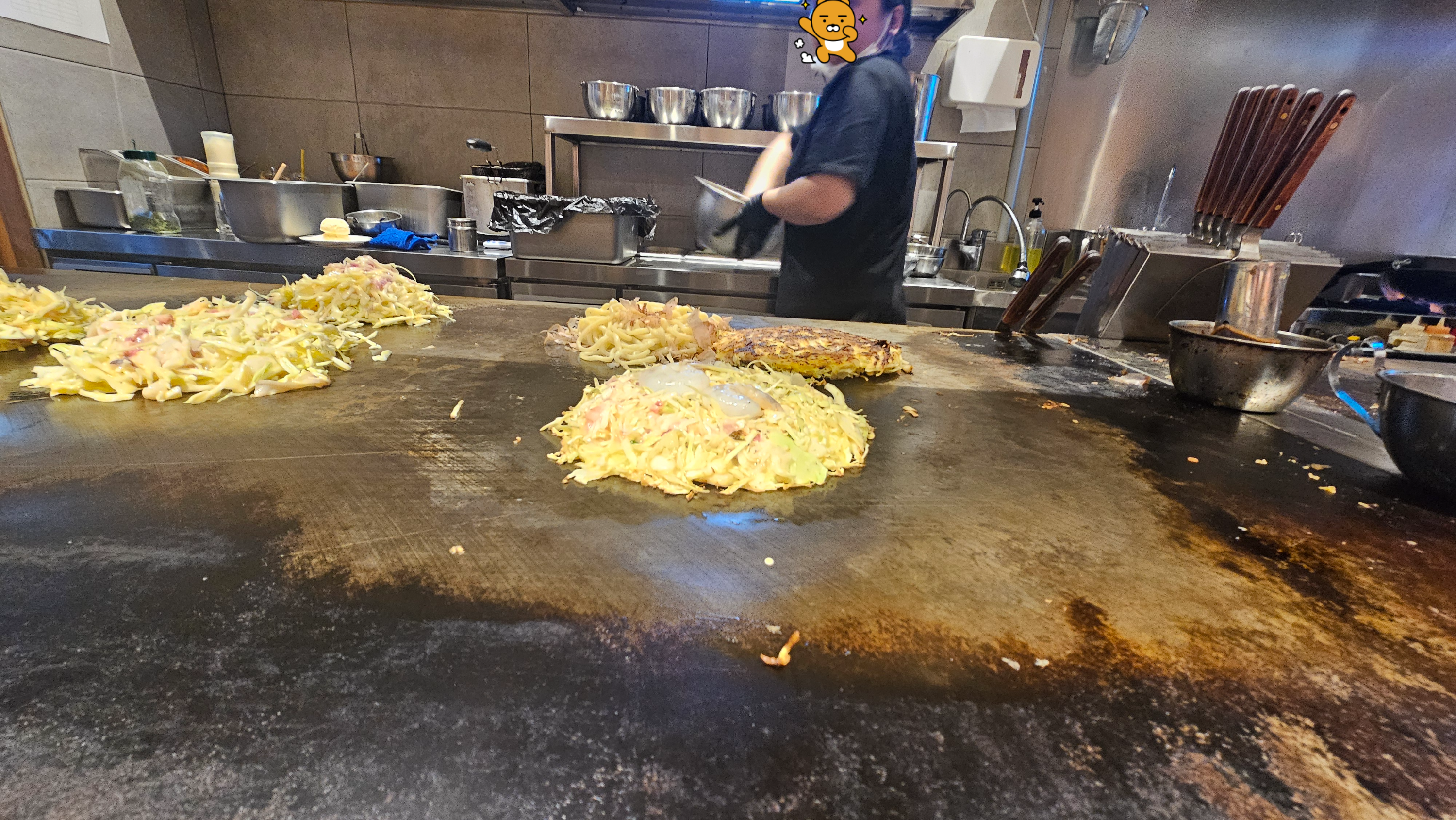 돼지고기와 치즈가 듬뿍 들어간 오코노미야끼는 겉은 바삭하고 속은 촉촉해서 식감이 정말 좋았어요. 철판에서 바로 구워내 따뜻한 상태로 제공되니 풍미가 배가되더라고요.