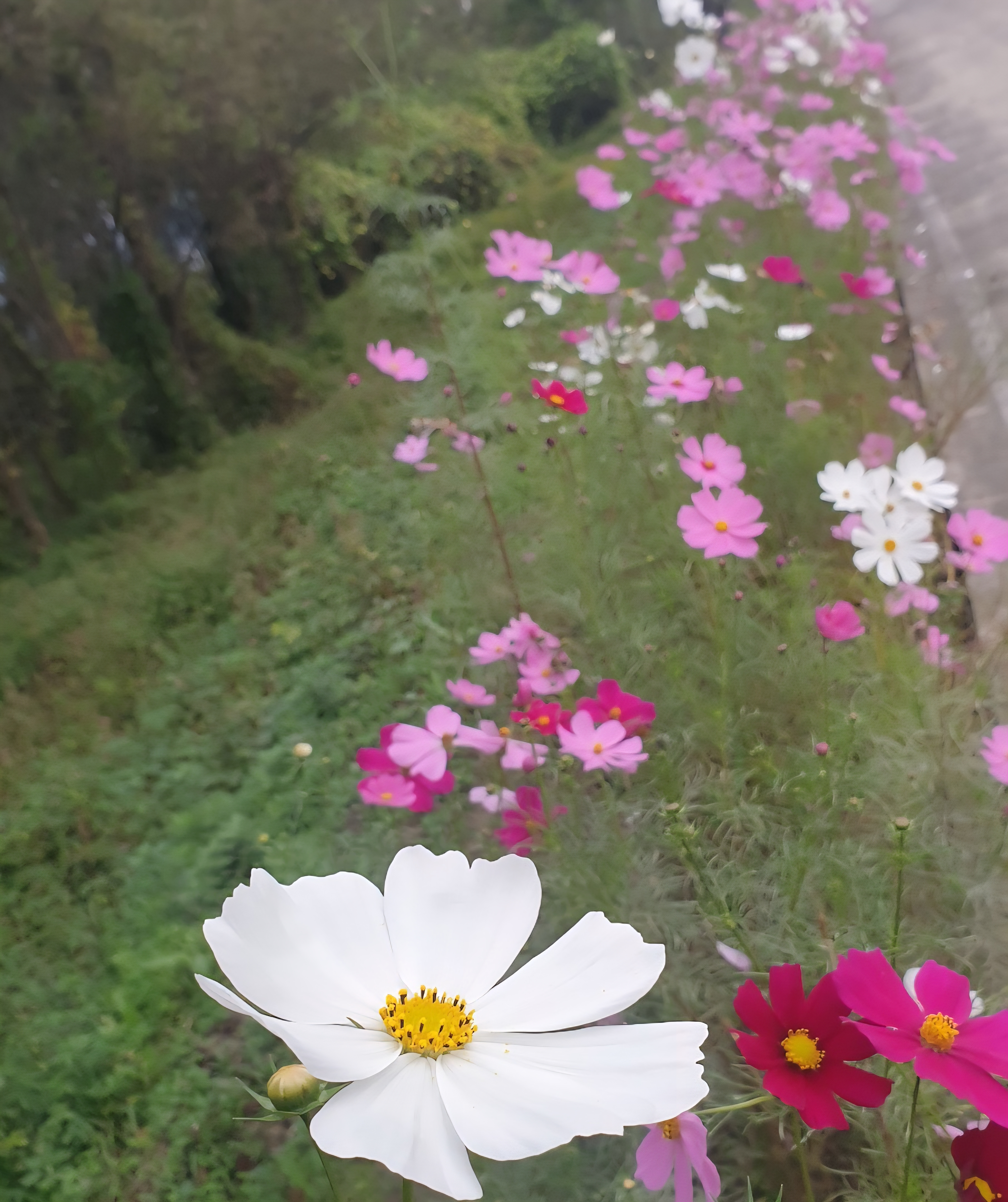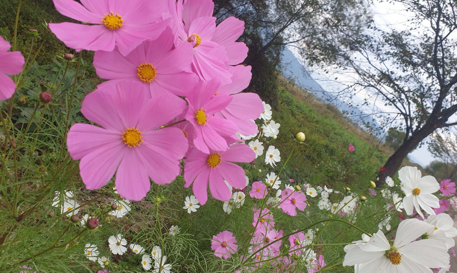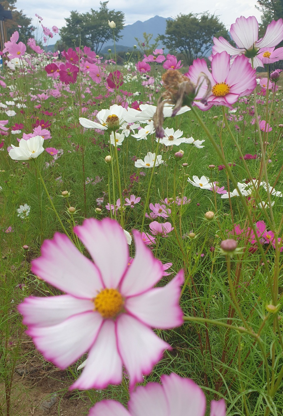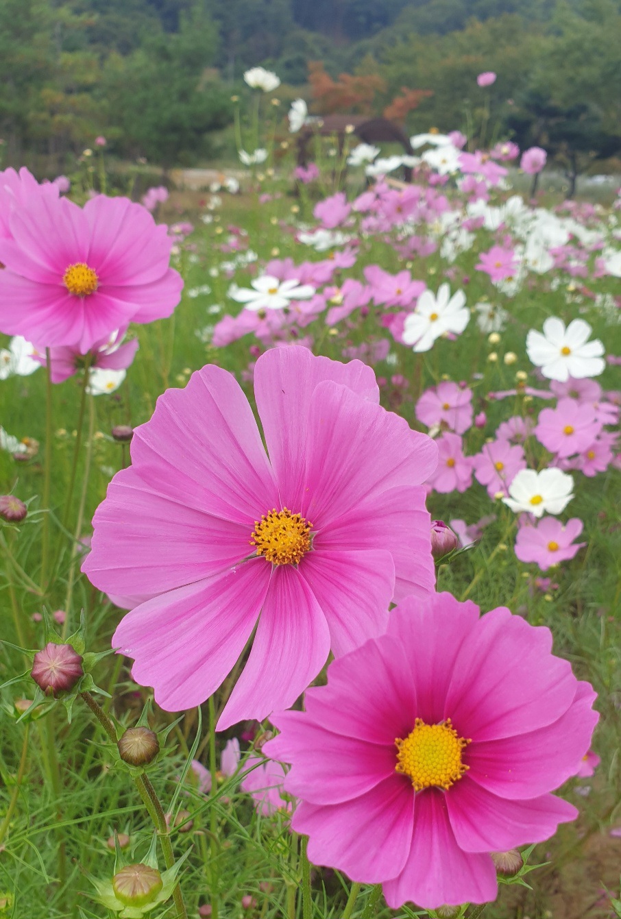 분홍빛, 흰빛, 연보라빛 코스모스들이 바람에 흔들리며 “어서 와~” 하는 느낌이랄까요?