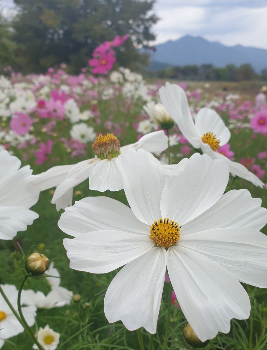 분홍빛, 흰빛, 연보라빛 코스모스들이 바람에 흔들리며 “어서 와~” 하는 느낌이랄까요?