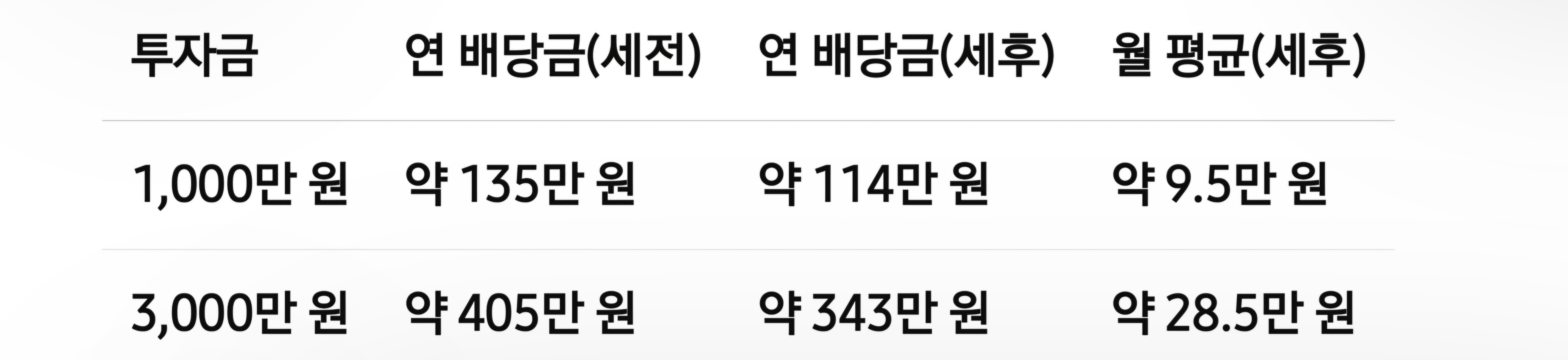 먼저, 투자금액이 달라지면 배당 체감이 어떻게 달라지는지 정리해봤어요.