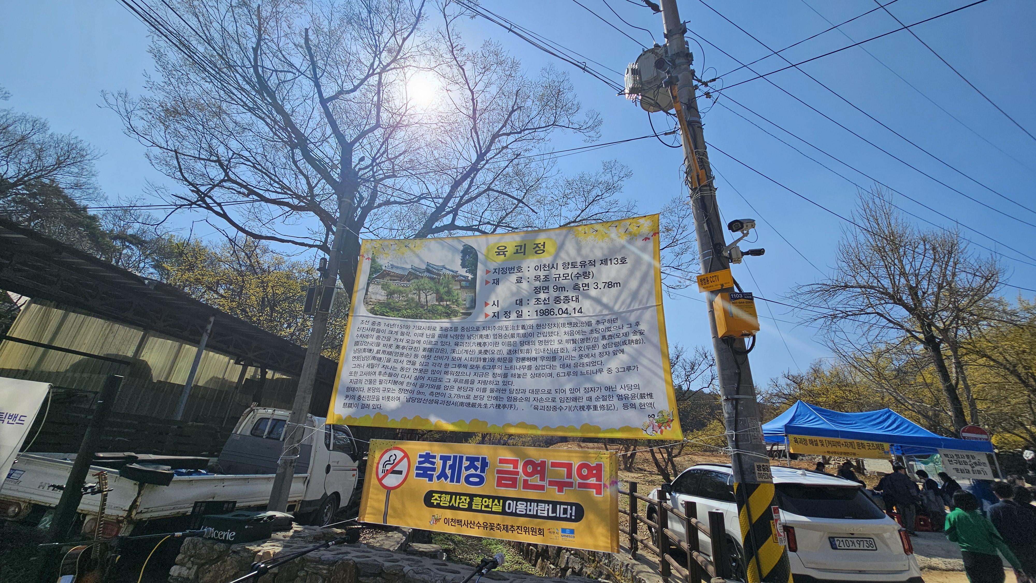 ③ 도립리 육괴정의 고즈넉함 축제 메인 무대는 시끌벅적하지만, 조금 안쪽으로 들어와 '육괴정' 근처를 거닐면 고택과 어우러진 산수유의 우아함을 느낄 수 있어요. 담벼락 너머로 고개를 내민 노란 꽃가지들이 파란 하늘과 대비되는 모습은 올해도 베스트 컷!