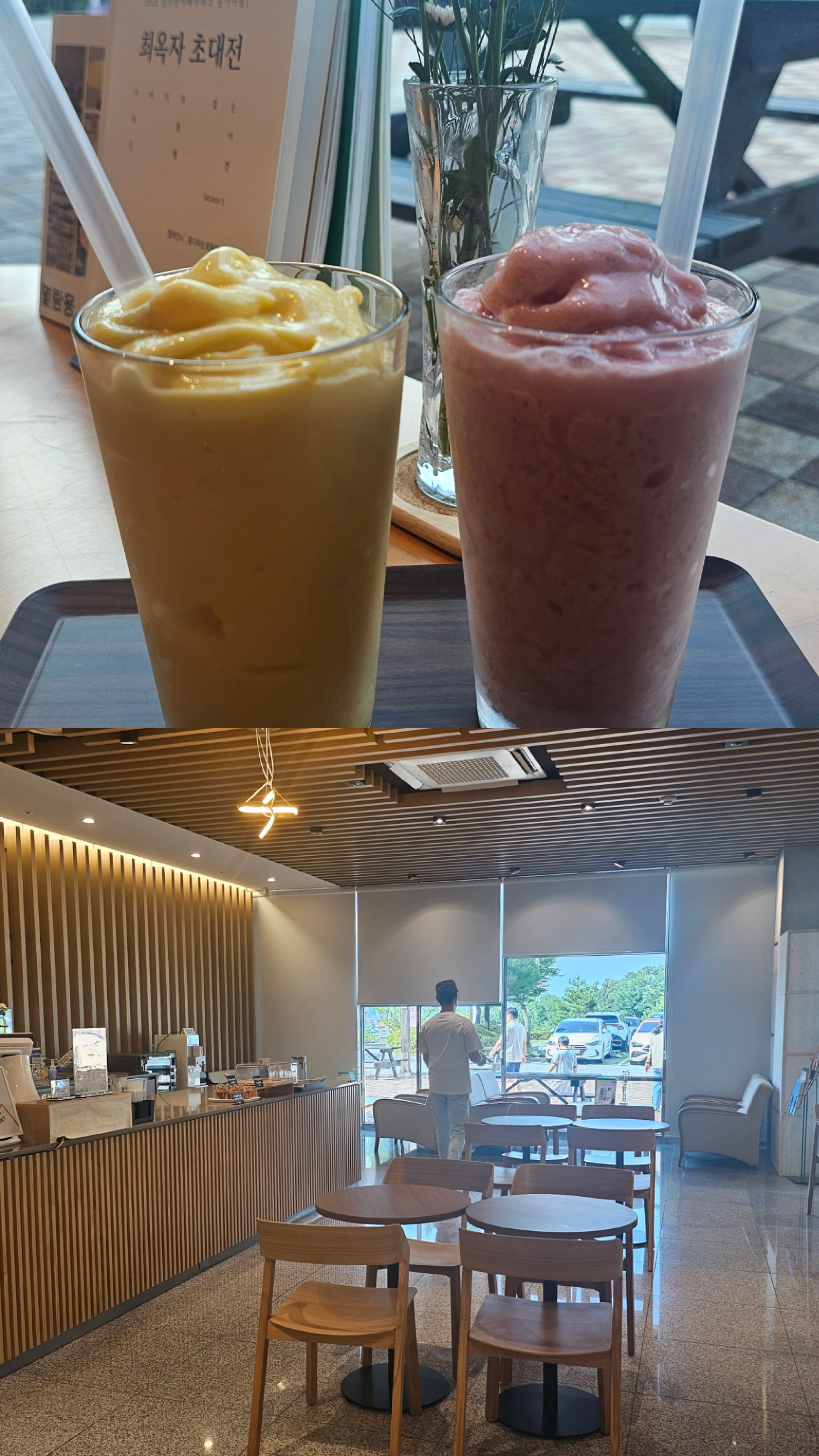전시 관람 전, 더위에 지쳐 로비 카페에서 음료를 주문했어요.